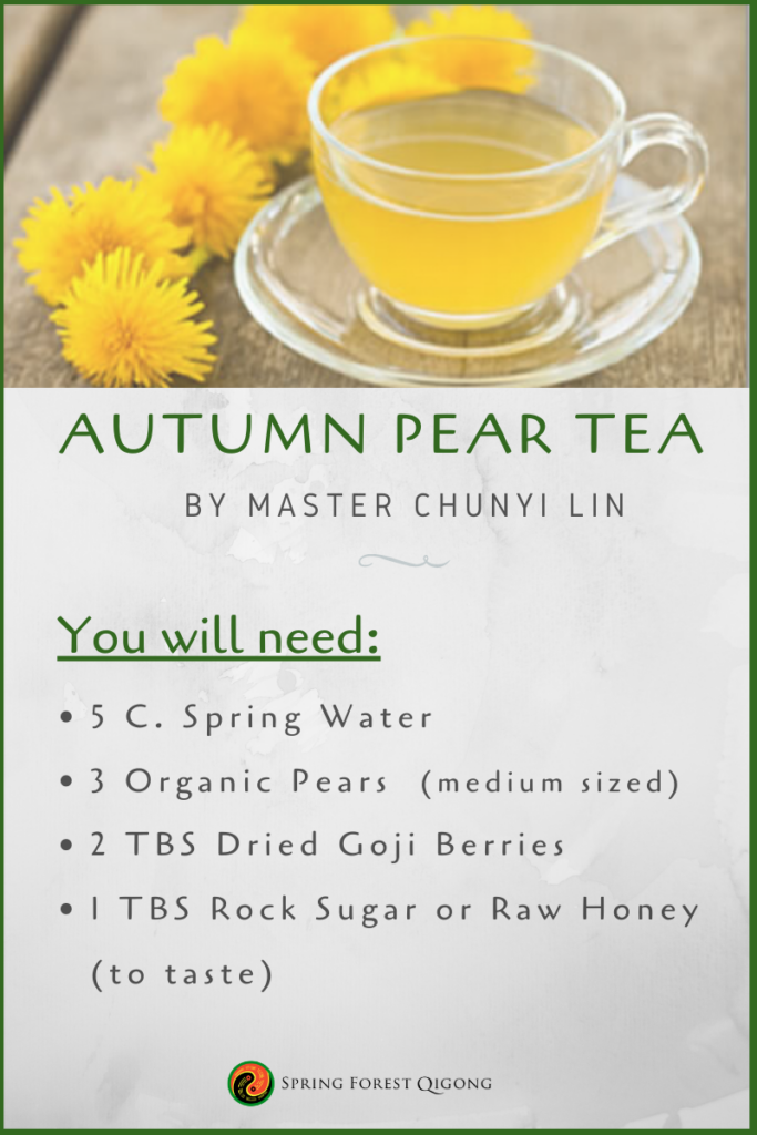 Master Lin’s Autumn Pear Tea In this recipe you can use standard pears or Asian pears. Makes 3 Servings 5 cups of Spring Water 3 medium size organic pears, cut, core and chop in 1 inch pieces 2 TBS dried Goji Berries 1 TBS Rock Sugar (traditional Chinese) or raw honey to taste […]
