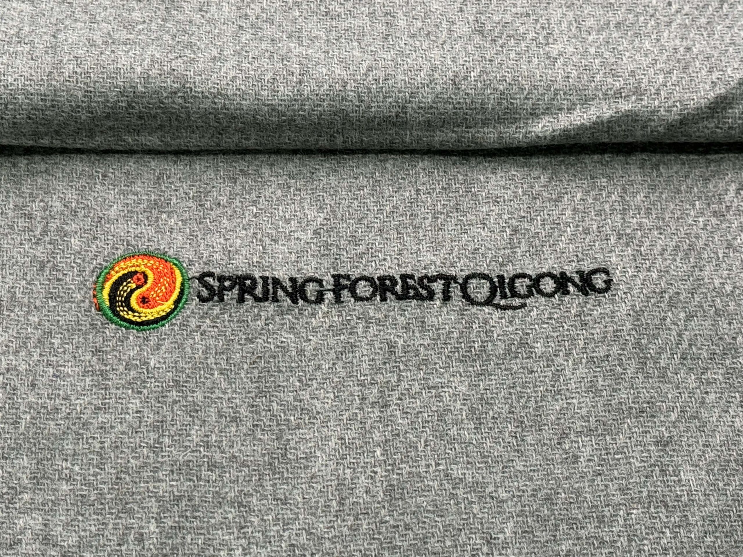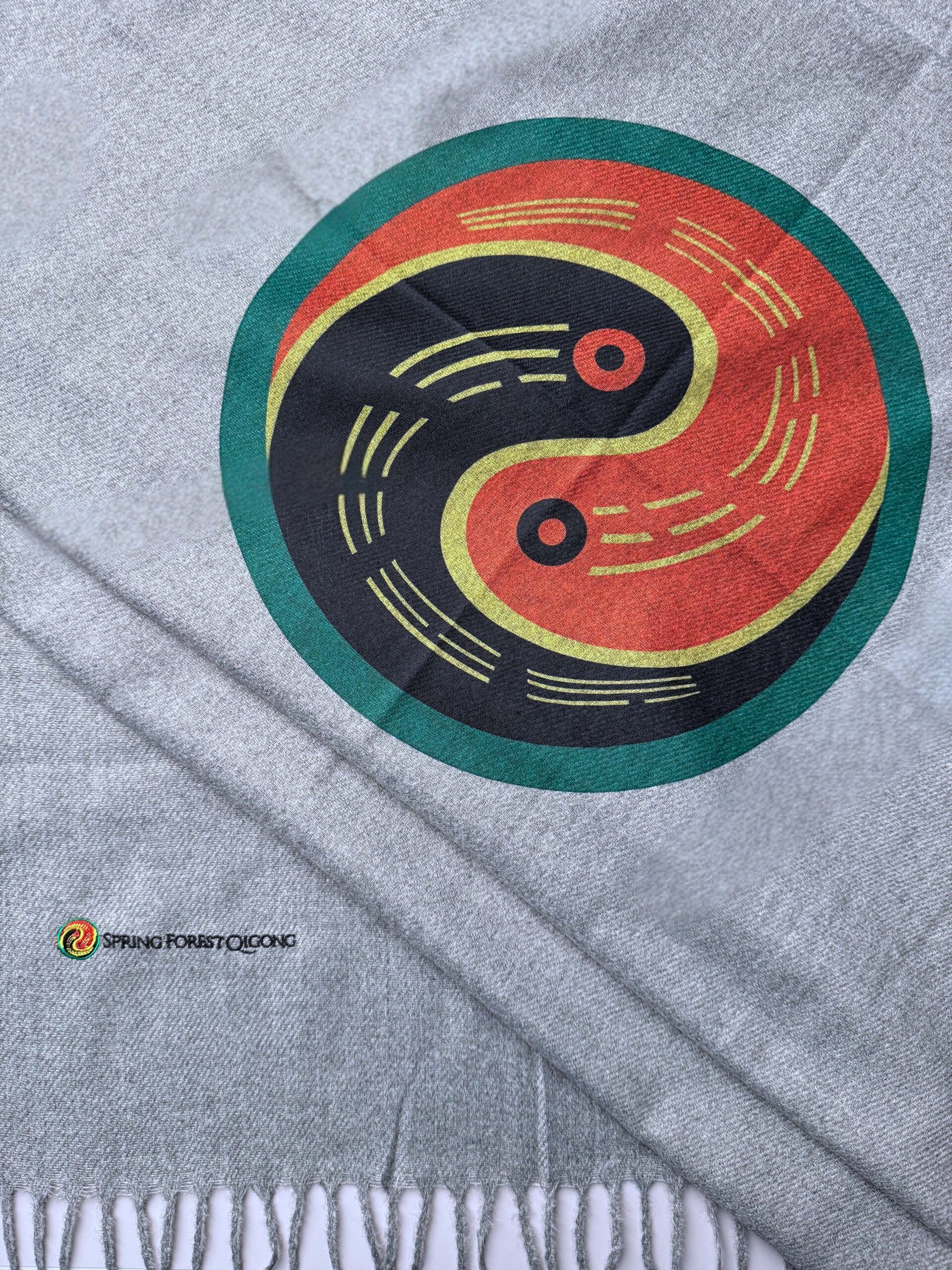 This calming gray Shawl is features Spring Forest Qigong’s Yin Yang logo and is 28 inches x 79 inches .